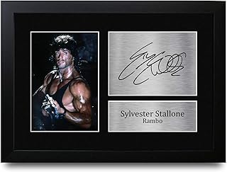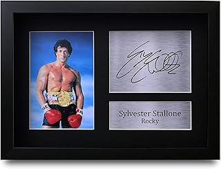 Montage Photo avec Autographe de Sylvester Stallone dans Rocky IV; Présentoir photo 25 x 20 cm avec légende. Montage professionnel. Cadeau idéal, prêt à être encadré. Impression photographique de haute qualité appliquée sur une monture biseautée noire de 1,5 mm d'épaisseur. Les autographes sont préimprimées. Superbe objet de collection à prix très abordable. Professionnellement fabriqué dans notre studio, ce modèle A4 (297 x 210 mm) sans cadre de Sylvester Stallone Rambo John dispose d'une image de qualité supérieure avec des copies imprimées de l'autographe de la célébrité. Montée sur une feuille cartonnée noire et matte, sans acide. Très belle finition avec une plaque argentée imprimée du prénom. Légère, mais de la plus haute qualité, elle constitue le cadeau de Noël/anniversaire idéal pour les fans de tout âge, et le